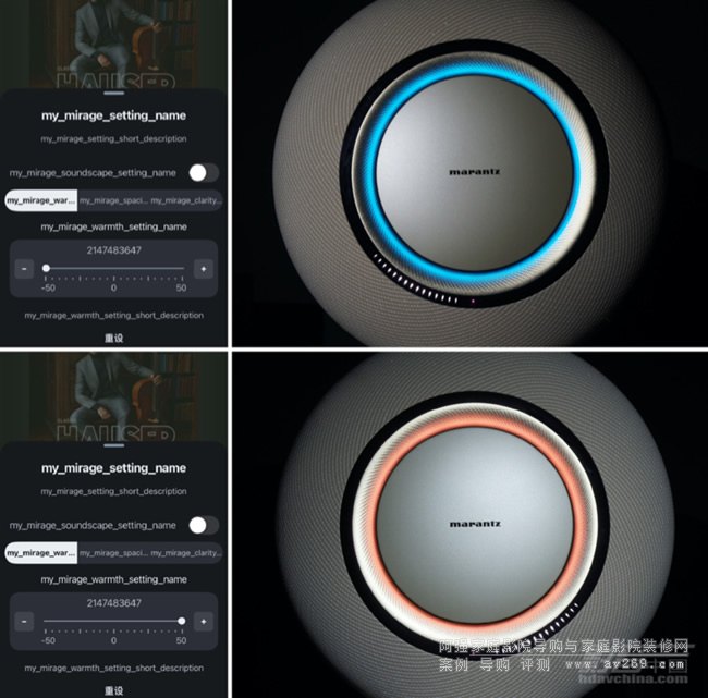 要體驗Marantz Mirage™功能,給Grand Horizon推送音樂就要使用HEOS App,連接之后會要求升級支持Marantz Mirage™功能。其中,Marantz Mirage™里面的“Warmth”可以調整背光部分的色溫和音色。往左調時冷色溫,往右調是暖色溫。兩種色溫效果都給我帶來不一樣的視覺效果、不一樣的聲音感受,甚至不一樣的心情。