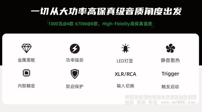大功率:1000W@4ohm, 670W@8ohm,適用于大空間,高功率前置三聲道揚聲器系統;