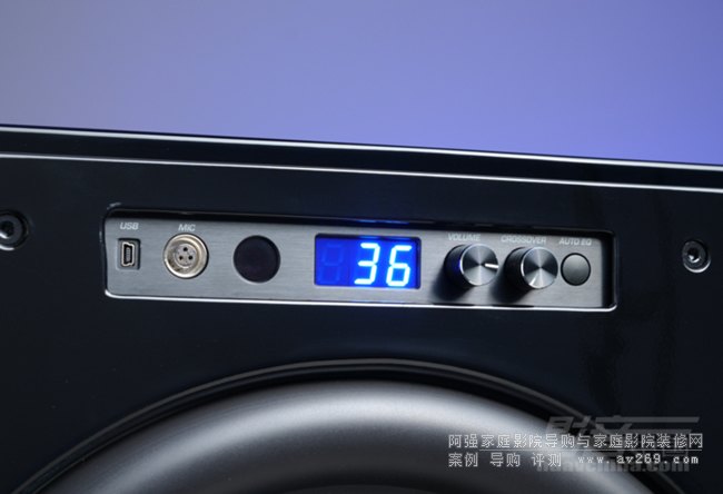 如果將低音炮的外觀設(shè)計(jì)列出一個(gè)顏值榜單,DDP系列無疑會名列前茅。DDP-15采用了高端的鋼琴烤漆工藝,表面光滑且富有光澤感,給人一種極為精致的視覺享受。箱體設(shè)計(jì)上,DDP-15呈現(xiàn)前寬后窄的流線型結(jié)構(gòu),搭配略帶弧度的兩側(cè)面板,使得整體造型既簡潔又充滿優(yōu)雅氣質(zhì)。低音單元上方是一個(gè)集成了多項(xiàng)功能的調(diào)節(jié)區(qū)域,包括低通分頻點(diǎn)和音量調(diào)節(jié)旋鈕。此外,還配備了一塊顯示屏,用于實(shí)時(shí)顯示音量信息,提升了科技感和現(xiàn)代感。當(dāng)你調(diào)整分頻點(diǎn)時(shí),頻率值也會直接顯示在顯示屏上,確保每次調(diào)節(jié)都精準(zhǔn)可見。右側(cè)的AUTO EQ按鈕長按五秒即可啟動自動調(diào)節(jié),進(jìn)一步簡化了用戶的操作流程。此外,顯示屏左邊還配有USB和MIC插口,用戶可以通過USB連接電腦進(jìn)行系統(tǒng)校正,或通過MIC接口接入Velodyne附送的測試麥克風(fēng),完成專業(yè)的音頻調(diào)校。