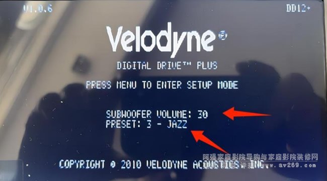 開機后會通過小屏幕看到主界面,默認模式為PRESET:3 -JAZZ模式,默認音量SUBWOOFERVOLUME:30