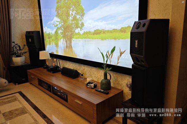 本案在精裝修客廳影院里面使用的大部分影音設(shè)備為現(xiàn)成的,阿強根據(jù)整套系統(tǒng)進行了部分升級,主要是視頻系統(tǒng)加點歌機,麥克風等,影院主要是超重低音炮和環(huán)繞音箱等,視頻投影機為了布線美觀采用壁掛安裝不是完全居中安裝的,通過愛普生大范圍鏡頭位移功能使用畫面可以投滿整個屏幕,整案功能和布置呈現(xiàn)出來的效果超出客人的期許,后續(xù)對老舊設(shè)備將慢慢升級中...