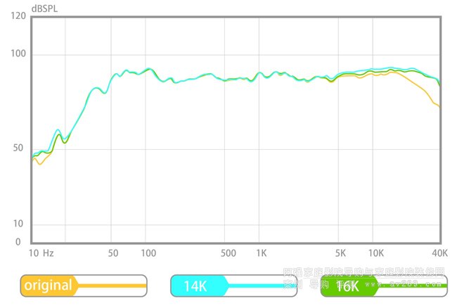 曲線變化示意圖:使用Aperion超高音音箱后,原始音箱曲線/14Khz曲線/16Khz曲線對(duì)比