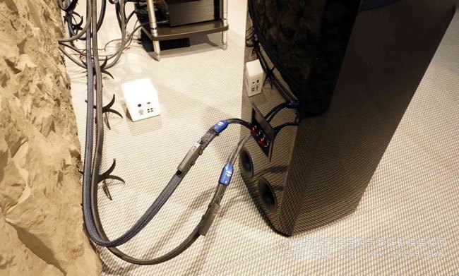 這是展房內JBL Summit Makalu喇叭背面,可以看到取下ㄇ字橫桿之后,就是以兩組喇叭線與Mark Levinson后級接續。