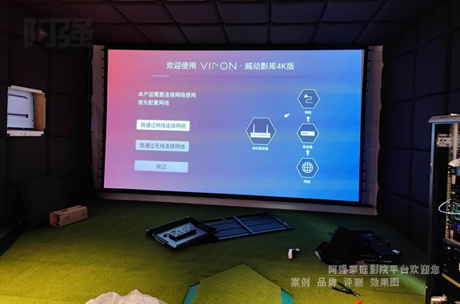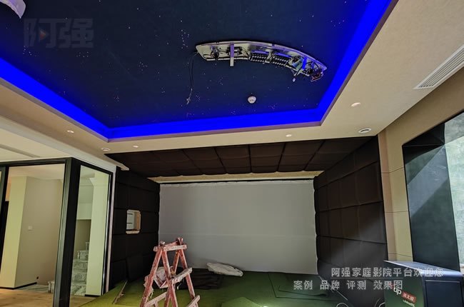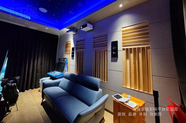 對于高爾夫模擬場景,還需注意投影幕布材質。抗環境光幕能提升對比度,而帶有微細紋理的幕面可增強立體感,使虛擬球道更接近真實場地效果。若預算允許,可優先考慮激光投影方案,其長壽命和穩定亮度特別適合高頻使用場景。如果對觀影畫質要求高,可啟用另一套適合觀影的家用投影機和專用投影幕,兩者進行融合。你今天看到的這個案子就是采用兩套視頻系統,采用了兩套投影和投影幕。