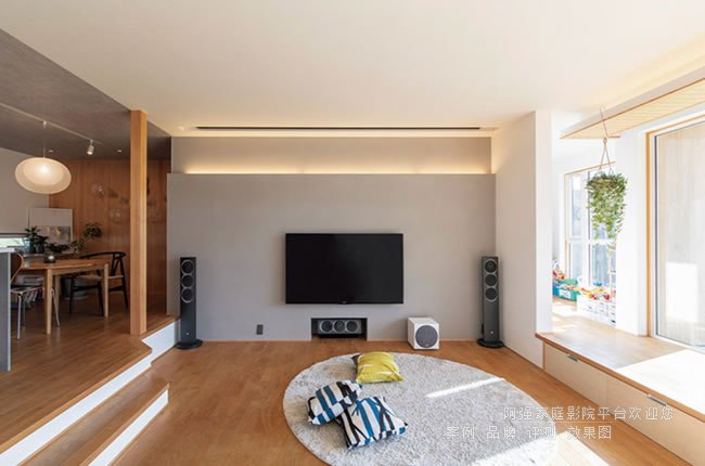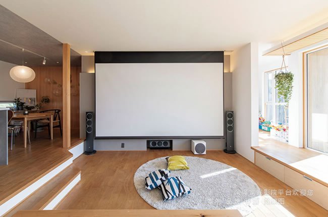 今天看的一套影音系統在一棟復式空間里面,在閣樓的一層起居室做影音空間,使用了150英寸電動幕,同時保留了平板電視的功能,電視墻處一的音箱采用了傳統落地音箱擺放,而后部聽音區域均使用天花嵌入以保證簡約美觀。