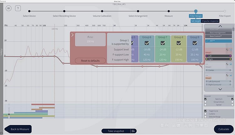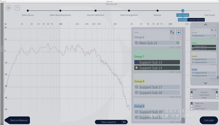 支撐低音炮(第7組)應提供增強支撐(因此-24dB),以實現(xiàn)所需的頻率響應。后支撐低音炮(第9組)應降低音量,并將截止頻率設置為100Hz,以避免任何定位問題(如果座位位置離低音炮太近)。