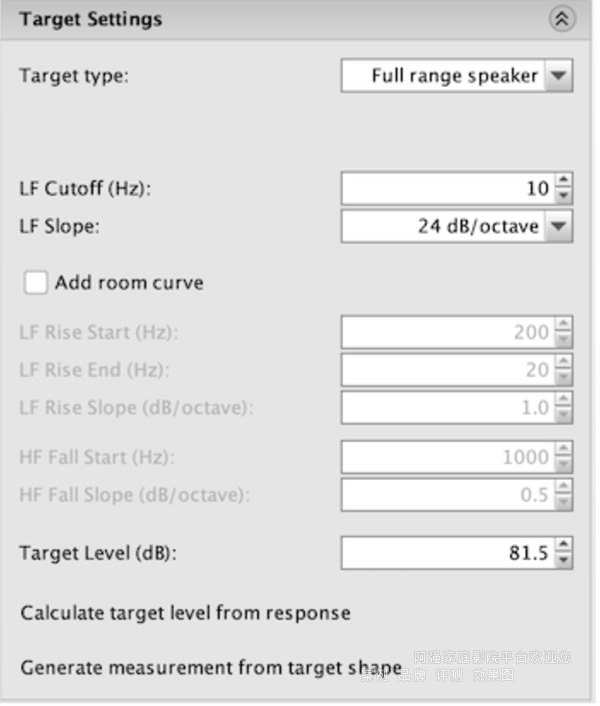 將目標類型設置為“全范圍揚聲器”以設置一個平坦目標。設置目標電平,以便用切音濾波器實現所需的均衡。你需要嘗試不同的目標水平,因為不同數值可能會給出不同的結果。