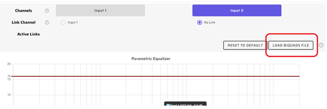 然后返回miniDSP用戶界面,打開你想放置濾波器的PEQ模塊。如果你用的是miniDSP設備控制臺,選擇右上角的菜單開關,點擊加載BIQUADS文件按鈕,然后選擇你之前保存的系數文件。