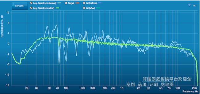 Dirac Live 校準(zhǔn)工具校正房間內(nèi)測(cè)量的振幅響應(yīng),以符合指定的“目標(biāo)曲線”。通常,低音會(huì)有上升,高音略有下降。這張圖顯示了左右揚(yáng)聲器的未校正響應(yīng)(藍(lán)色),校正后的響應(yīng)(綠色表示)(圖中平均九項(xiàng)測(cè)量):