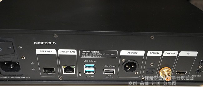 轉向后面板,有一個IEC市電進氣口和電源開關。兩個網絡端口(千兆和SFP光纖),或雙頻Wi-Fi,將T8連接到家庭網絡。如果你用的是有線端口,設備也可以通過局域網喚醒開機。數字輸出包括AES/EBU、TOSLINK光纖、同軸、通過HDMI的I2S和USB-A接口。Eversolo 還配備了 12V 觸發輸入和輸出。唯一可能被遺漏的是外部時鐘輸入的配置。