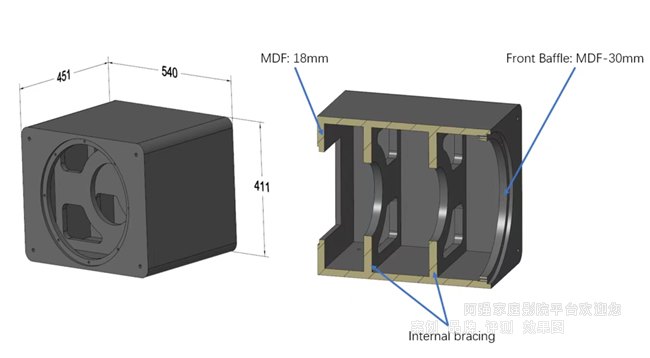 箱體與物理規格密閉加固型MDF箱體,內部加強筋結構可降低箱體諧振,黑色乙烯基飾面,黑色布藝網罩。